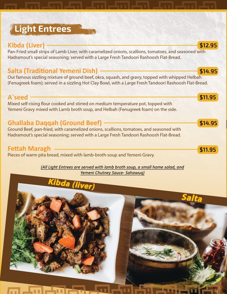Traditional Yemeni dish. Our famous sizzling mixture of ground beef, okra, squash, and gravy, topped with whipped helbah (fenugreek foam); served with a Large Fresh Tandoori Rashoosh Flat-Bread.