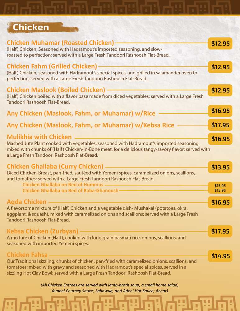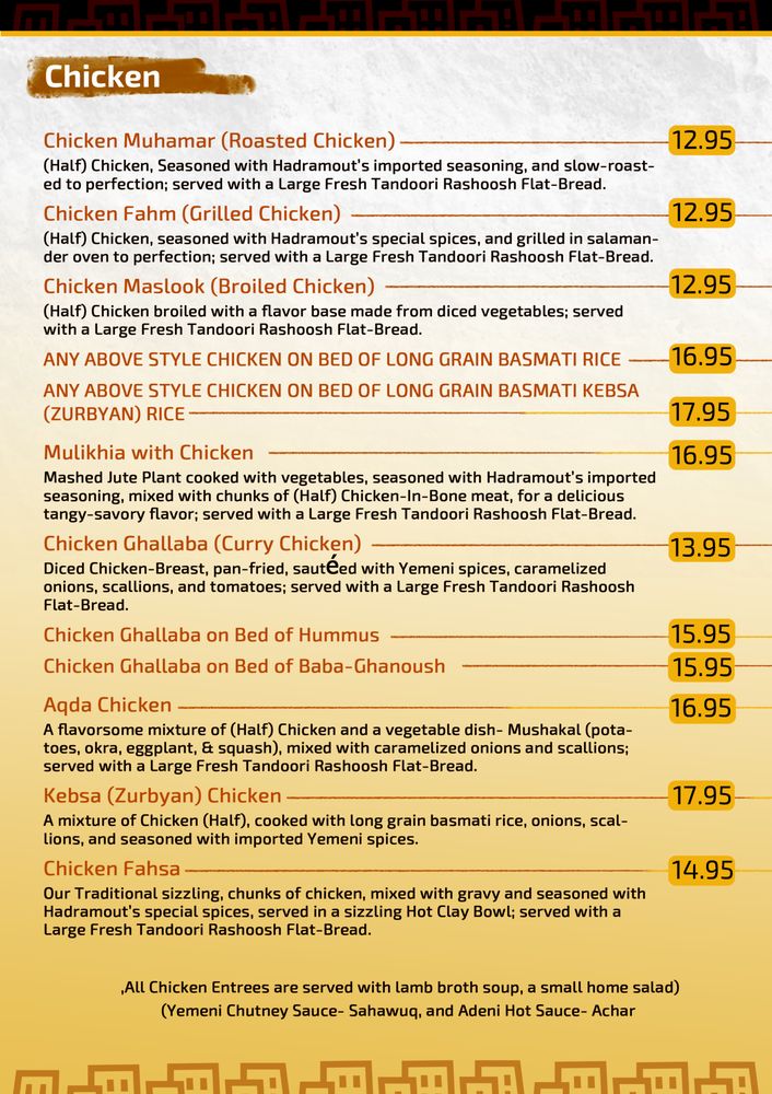 Seasoned with Hadramout's imported seasoning, and slow- roasted to perfection; served with long-grain Rice.
