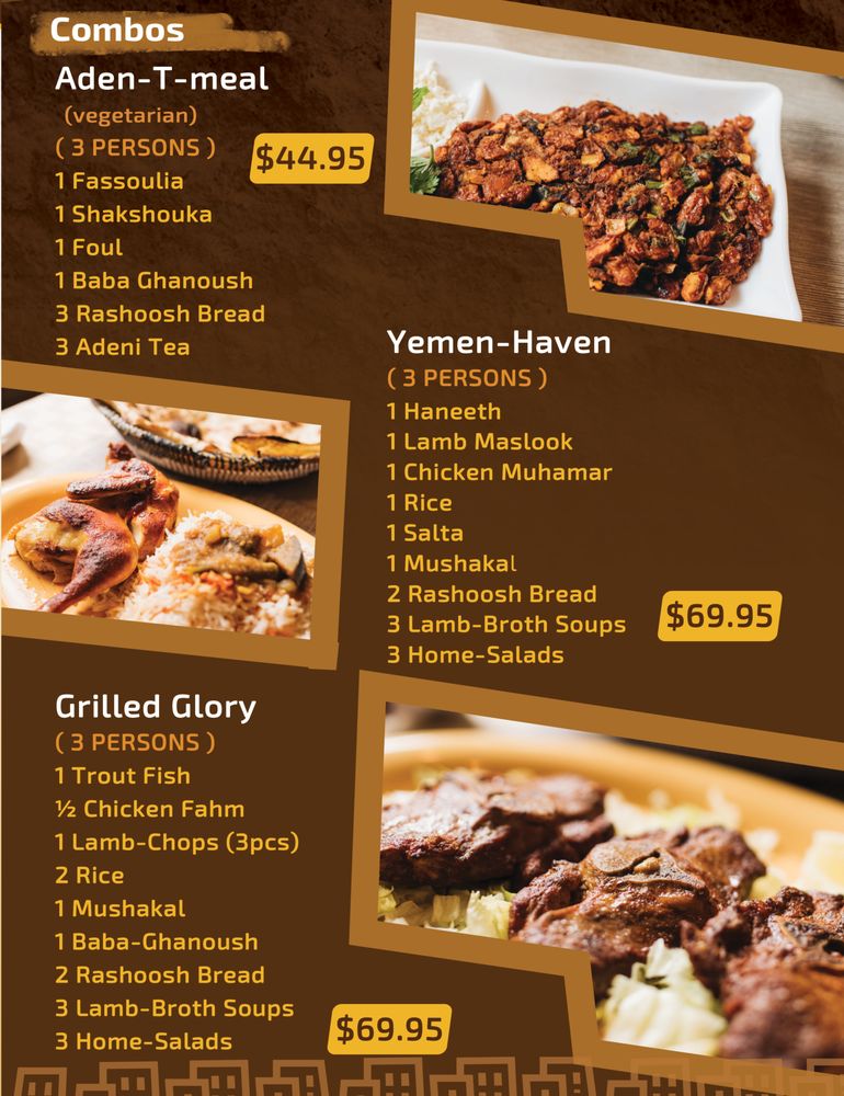For 3 persons. 1 fassoulia, 1 shakshouka, 1 foul, 1 baba-ghanoush, 3 rashoosh bread, 3 adeni tea. Vegetarian.