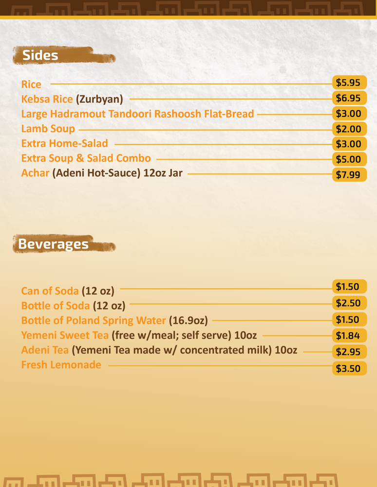 Hadramout Restaurant, located at 172 Atlantic Ave in Brooklyn, NY, offers a delectable menu of Middle Eastern cuisine. Their Chicken dishes, such as Chicken Muhamar and Chicken Fahsa, seasoned with imported spices, are slow-roasted or grilled to perfection. The Combos, like the Aden T-meal Combo and Vedge-Edge Combo, provide a variety of flavors for group dining. The reviews rave about the flavorful dishes, generous portions, and friendly staff. Offering delivery, takeout, and a casual dining experience, Hadramout Restaurant is a must-visit for those craving authentic Yemeni flavors. Give their homemade hummus and large flatbread a try, and don't miss out on their unique beverages like Yemeni Sweet Tea and Fresh Lemonade. Experience the communal dining atmosphere and enjoy a satisfying meal at Hadramout Restaurant.