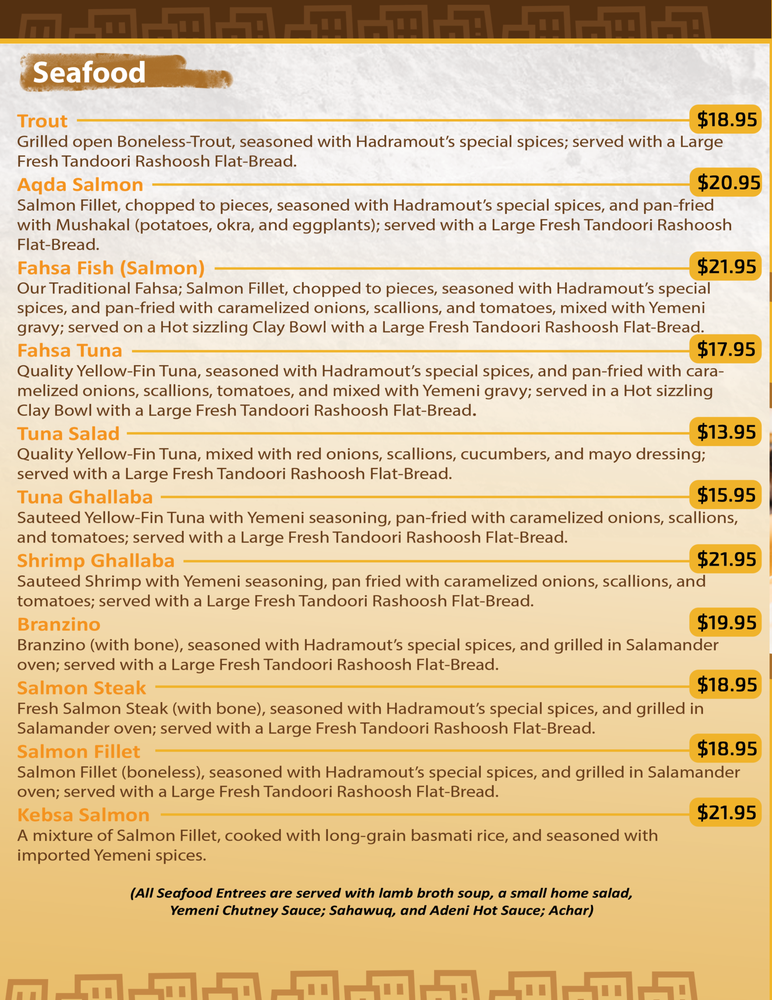 Quality yellow-fin tuna, seasoned with Hadramout's special spices, and pan-fried with caramelized onions, scallions, tomatoes, and mixed with Yemeni gravy; served with a Large Fresh Tandoori Rashoosh Flat-Bread.