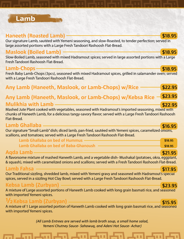Our signature "Small-Lamb" dish; diced lamb, pan-fried, sauted with Yemeni spices, caramelized onions, scallions, and tomatoes; served with a Large Fresh Tandoori Rashoosh Flat-Bread.